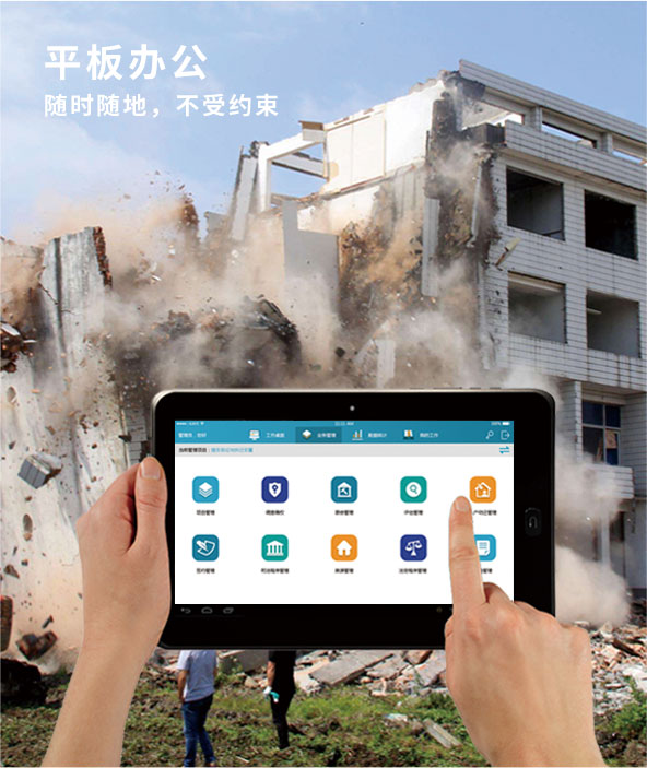 移动终端现场采集数据、拍摄照片、电子签字、生成打印协议,数据通过终端上传至数据平台,结合办公