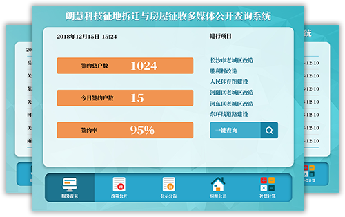 为了加强政府信息公开透明的阳光拆迁政策,对部分拆迁信息进行公示,方便老百姓查询,强化老百姓对拆迁政策的理解,助推政府征地拆迁工作的有序开展,朗慧科技研发了征地拆迁安置信息公开查询系统。
